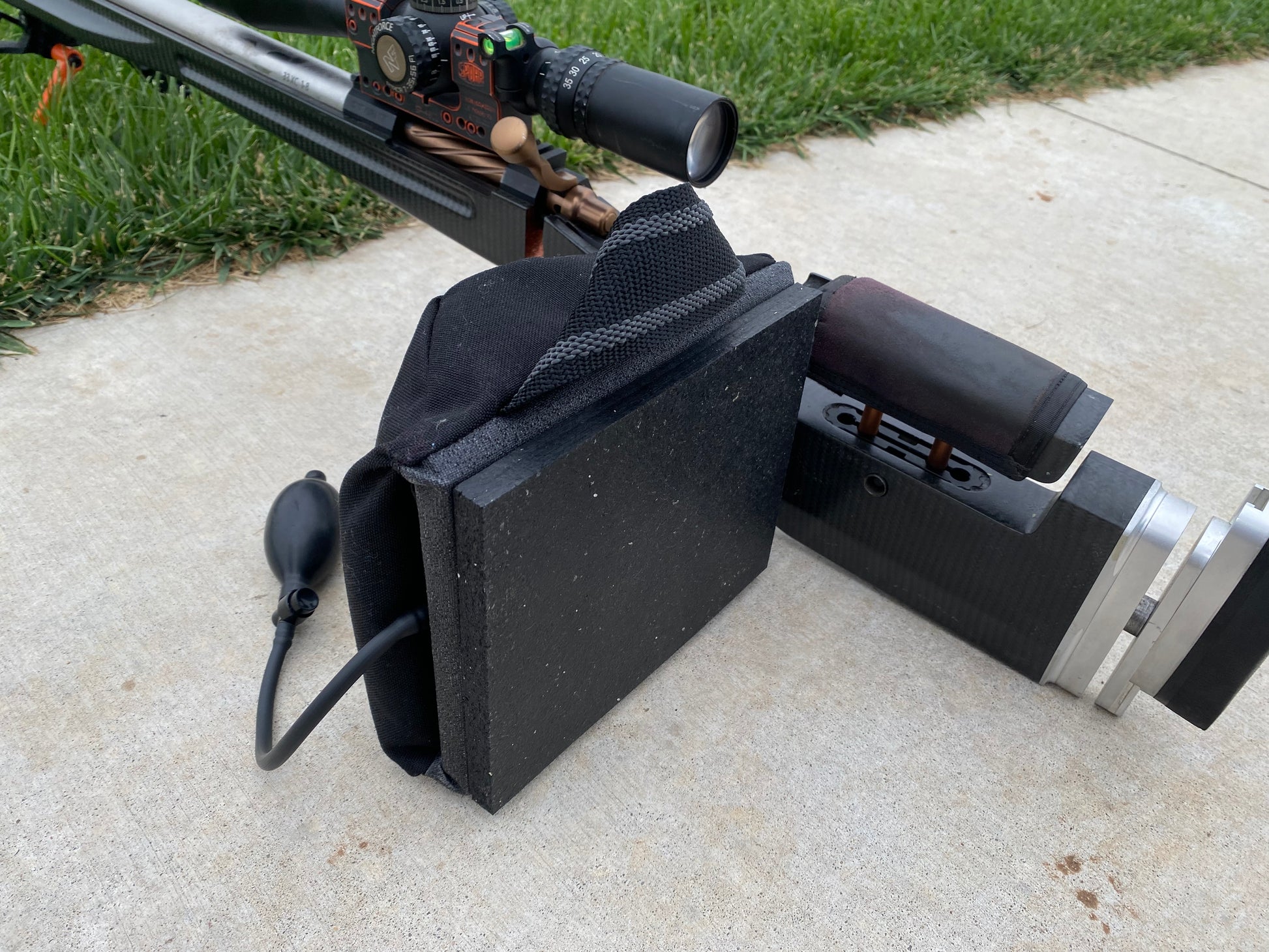 The Endgame is different from the Airfoil in a few ways, first you will notice the air pump comes out the side instead of the front. The new design of the front and rear panels are shaped to allow a perfect channel for your stock to ride in, being supported along the entire length of the flat section of your stock or adjustable bag rider. The slimmer shape (I call it volcano shape), also makes it easier to get your arm around when shooting from a bench. I rest my forearm along the sloped section and its very comfortable.
